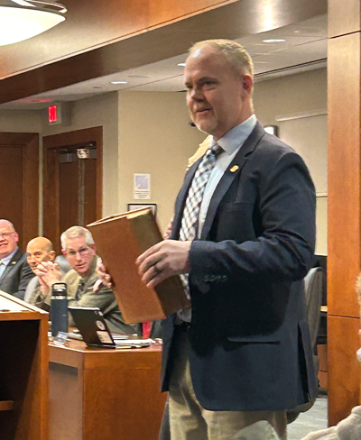 Receiving the Oath of Office from Jean Chrisman, Ontario County Clerk (and former Town of Canandaigua Town Clerk) with Jared's wife, Kellie, holding the Simpson Family Bible