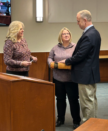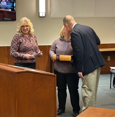 Receiving the Oath of Office from Jean Chrisman, Ontario County Clerk (and former Town of Canandaigua Town Clerk) with Jared's wife, Kellie, holding the Simpson Family Bible